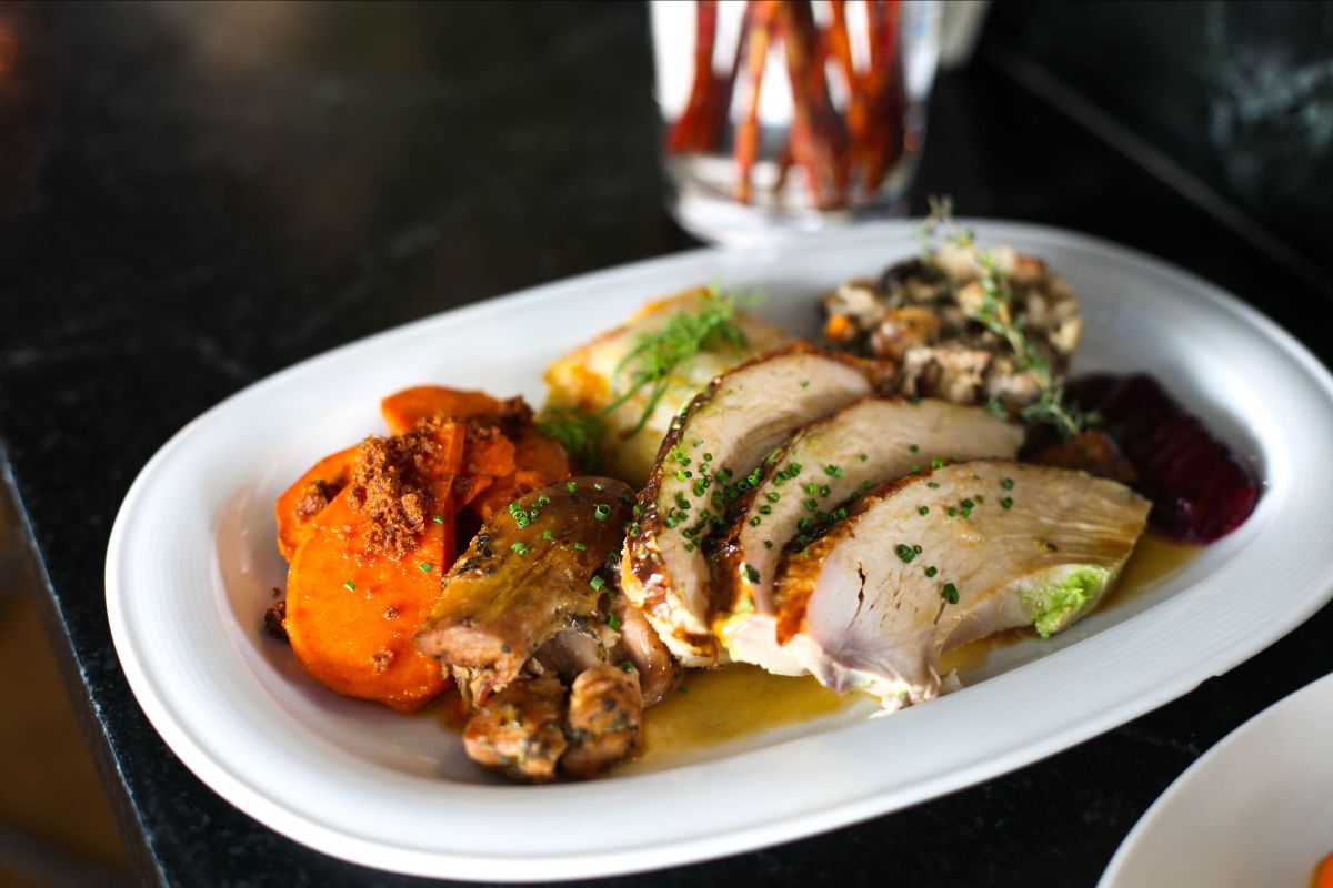 The 2020 menu for traditional thanksgiving from buca is sliced white meat turkey, homestyle gravy, roasted garlic mashed potatoes, spicy italian sausage stuffing, green beans, cranberry sauce, and pumpkin pie. The downtown restaurant is offering a takeout dinner for two ($100) that includes turkey or ham, biscuits and sides. Dinner for one features organic turkey, potatoes, stuffing, candied yams, pickled cranberry compote and turkey gravy for $57.